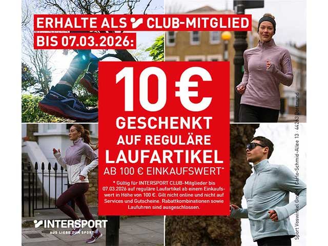 *Gültig für INTERSPORT Club-Mitglieder vom 27.02.-07.03.2026 auf reguläre Laufware ab einem Einkaufswert in Höhe von 100 €. Gilt nicht auf Laufuhren, nicht online und nicht auf Services & Gutscheine. Rabattkombinationen sind ausgeschlossen.