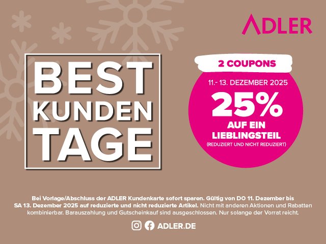 Bestkundentage bei ADLER von Donnerstag, 11. Dezember bis Samstag, 13. Dezember! Wir freuen uns auf tolle Bestkundentage mit vielen besonderen Aktionen und Programmpunkten.