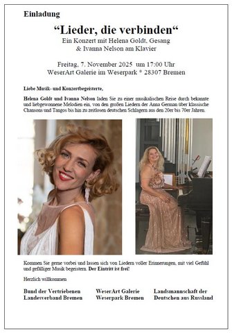 Helena Goldt und Ivanna Nelson laden Sie zu einer musikalischen Reise durch bekannte und liebgewonnene Melodien ein, von den großen Liedern der Anna German über klassische Chansons und Tangos bis hin zu zeitlosen deutschen Schlagern aus den 20er bis 70er Jahren.