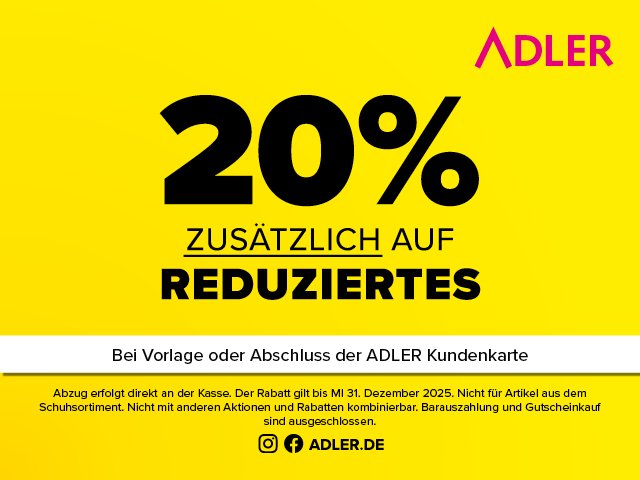 Sparen Sie 20% zusätzlich auf bereits reduzierte Artikel. Einfach ADLER Kundenkarte vorzeigen oder abschließen und 20% sparen. Gültig bis Mittwoch 31. Dezember 2025.